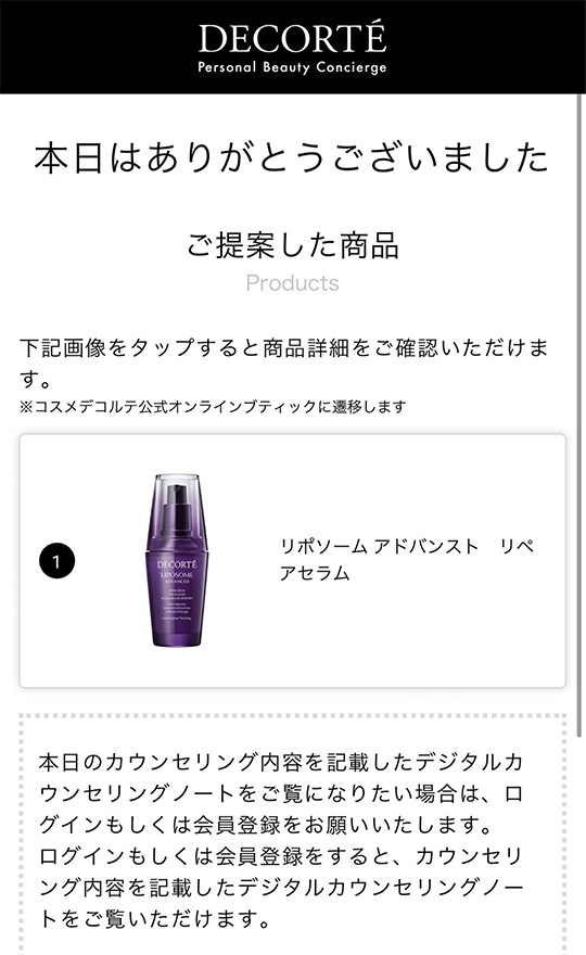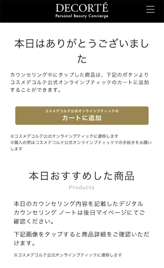 アンケート回答後の画面では、気になる商品情報をコスメデコルテ公式オンラインブティックでまとめてご確認いただく事ができます。