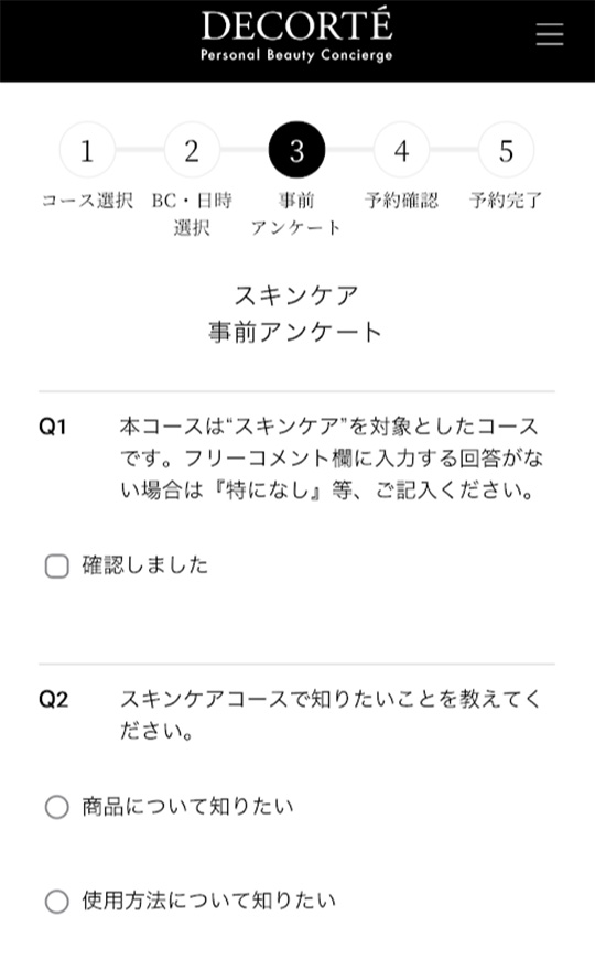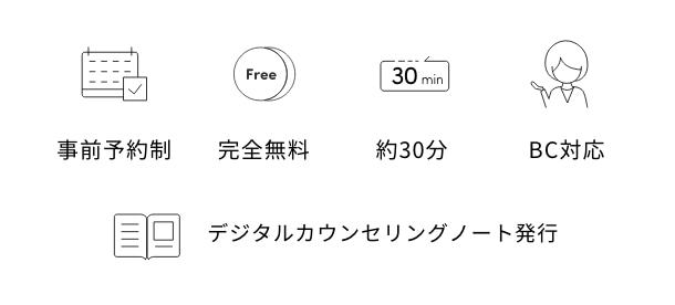 ※スキンケアのコースの場合、当日は肌解析のため、カウンセリングの前に写真撮影がございます。お時間に余裕を持ってご参加ください。