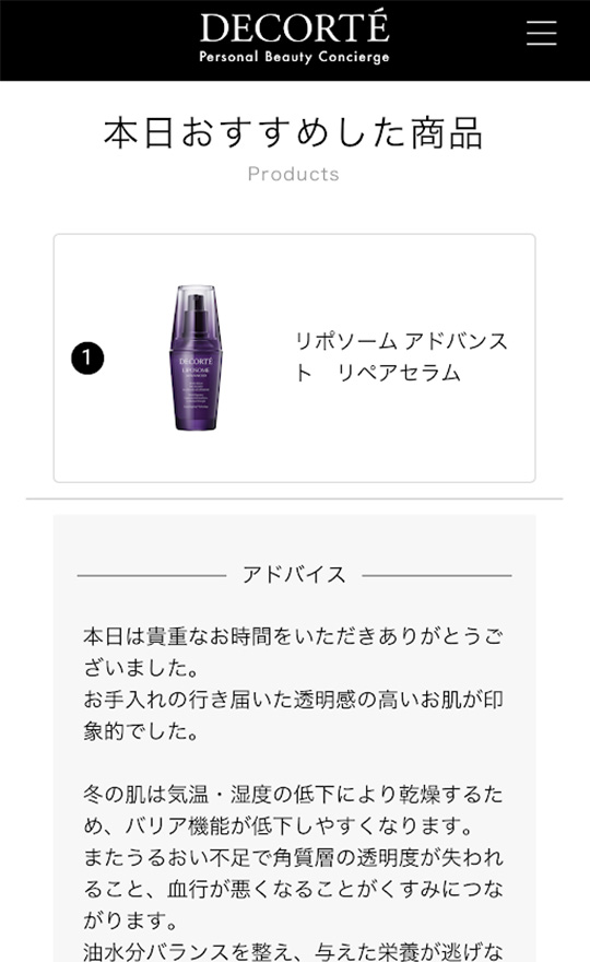 カウンセリング中にオススメした商品と発行したオリジナルアドバイスは、デジタル カウンセリング ノートとしてマイページに蓄積されていきます。